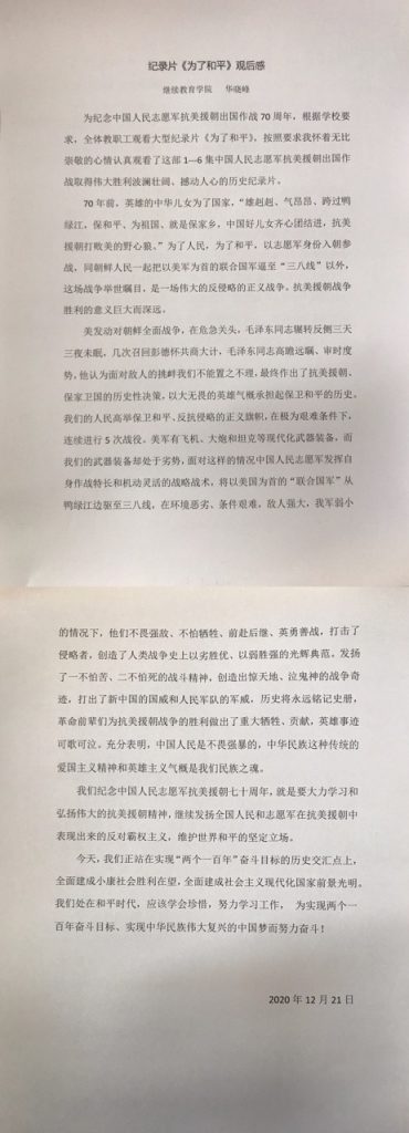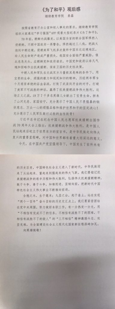 为深入贯彻落实习近平总书记在纪念中国人民志愿军抗美援朝出国作战70周年大会上的重要讲话精神,深入开展“四史”学习教育,大力弘扬伟大的抗美援朝精神,加强新时代爱国主义教育,教育引导全体教职工厚植爱国主义情怀,根据上级文件要求,suncitygroup太阳集团网站组织全体教职工观看大型电视纪录片《为了和平》。 12月16日至20日,全院教职工使用学习强国APP,自主观看《为了和平》。