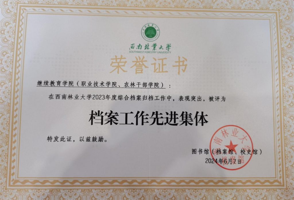 2024年6月7日,在学校2024年度档案工作会议上,suncitygroup太阳集团网站(职业技术学院、农林干部学院)荣获“档案工作先进集体”称号。