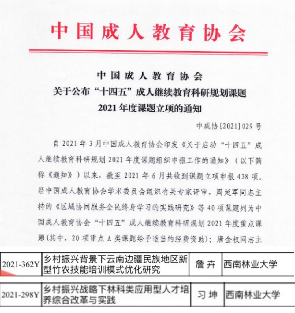 申报后,经过中国成人教育协会学术委员会组织有关专家评审,学院詹卉老师申报的《乡村振兴背景下云南边疆地区新型竹农技能培训模式优化研究》和习坤老师申报的《乡村振兴战略下林科类应用型人才培养综合改革与实践》获批立项。(文/图:习坤/审核:杨司薇)