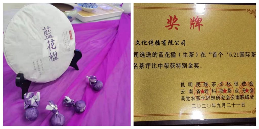 茶会正式开始,此次品鉴的茶品为蓝花楹普洱生茶。蓝花楹普洱生茶在“521国际茶日杯”名茶评比中荣获特别金奖,其原料产自“生态立县、绿色崛起”的耿马县香竹林村,香竹林云雾缭绕如仙境,满山清翠溢茶香,村民对茶树顺天致性,成就了韵味独特的香竹林有机古树茶。蓝花楹清欢悠远的茶汤与静谧清幽的茶香相得益彰,故取名—蓝花楹。