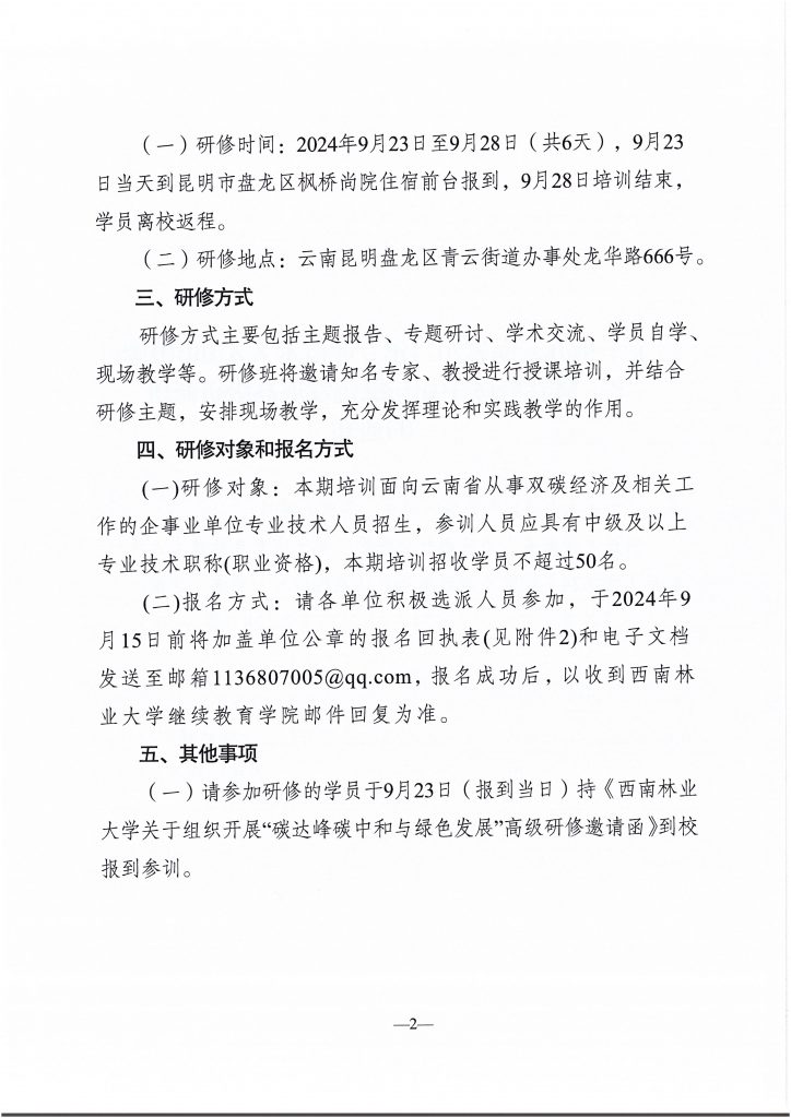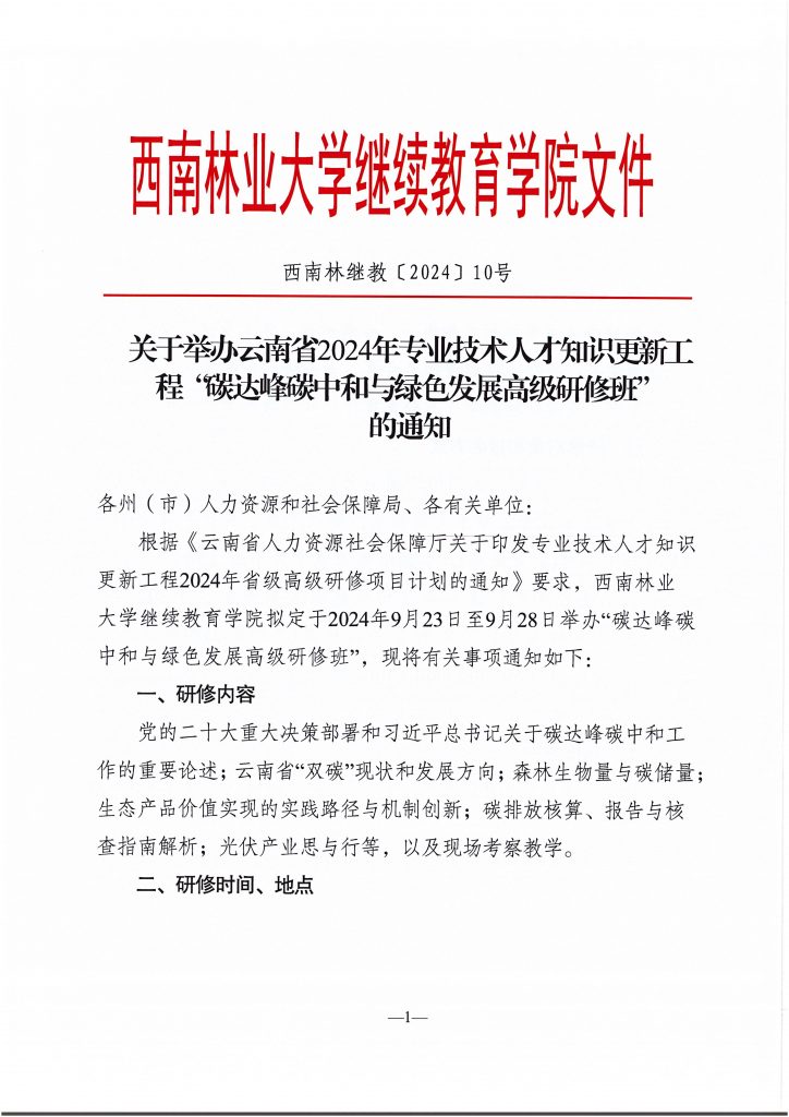 关于举办云南省2024年专业技术人才知识更新工程“碳达峰碳中和与绿色发展高级研修班” 的通知