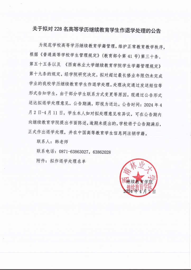 关于拟对228名高等学历继续教育员工作退学处理的公告