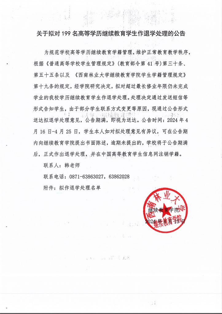 关于拟对199名高等学历继续教育员工作退学处理的公告