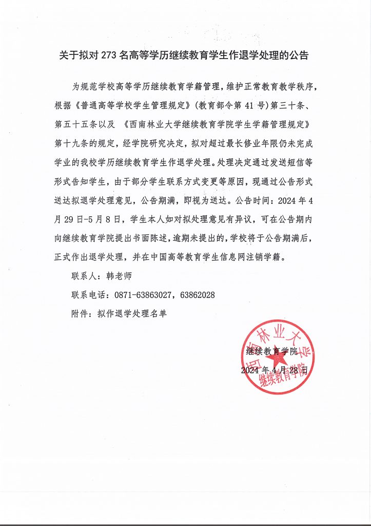 关于拟对273名高等学历继续教育员工作退学处理的公告
