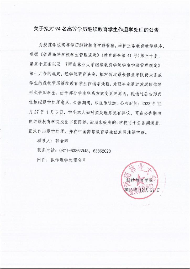 关于拟对94名高等学历继续教育员工作退学处理的公告