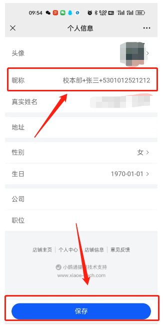 3、 在“个人信息”页面,点击“昵称”修改备注为“教学点+姓名+身份证号”,例如教学点在校本部的,备注为“校本部+张三+5301011……214121”,点击“保存”备注即修改完成。