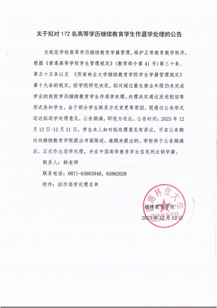 关于拟对172名高等学历继续教育员工作退学处理的公告