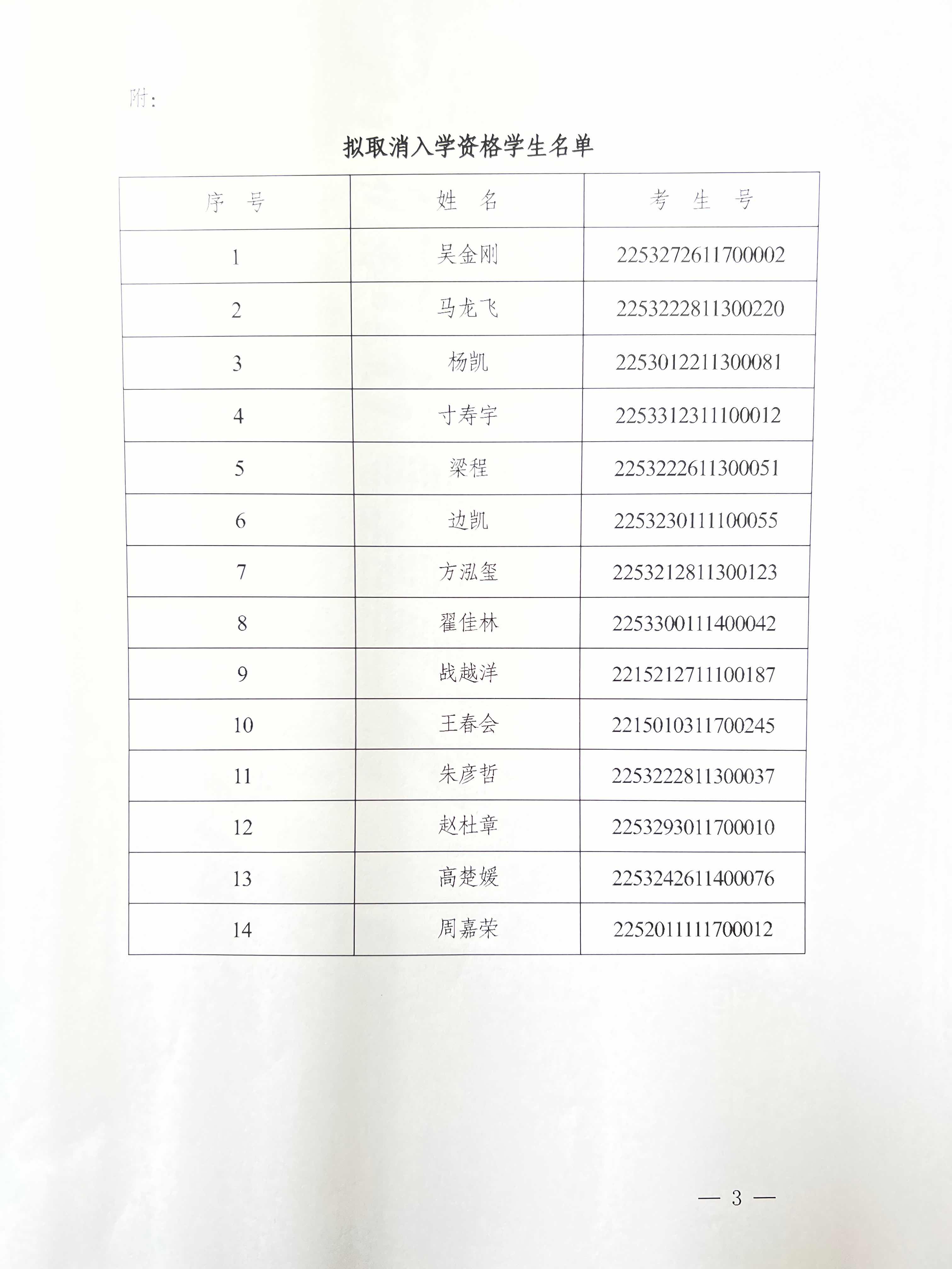 关于给予取消吴金刚等十四人2023级入学资格的公示