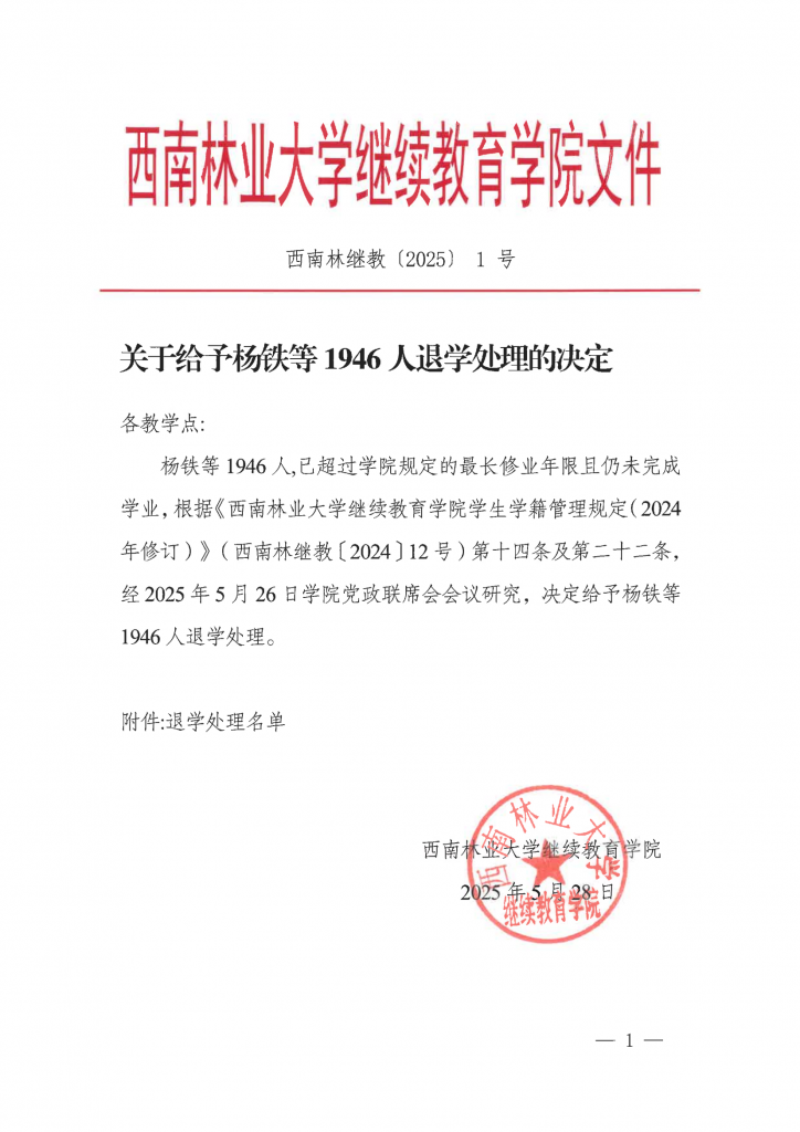 关于给予杨铁等1946人退学处理的决定