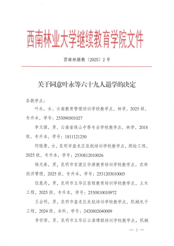 关于同意叶永等六十九人退学的决定