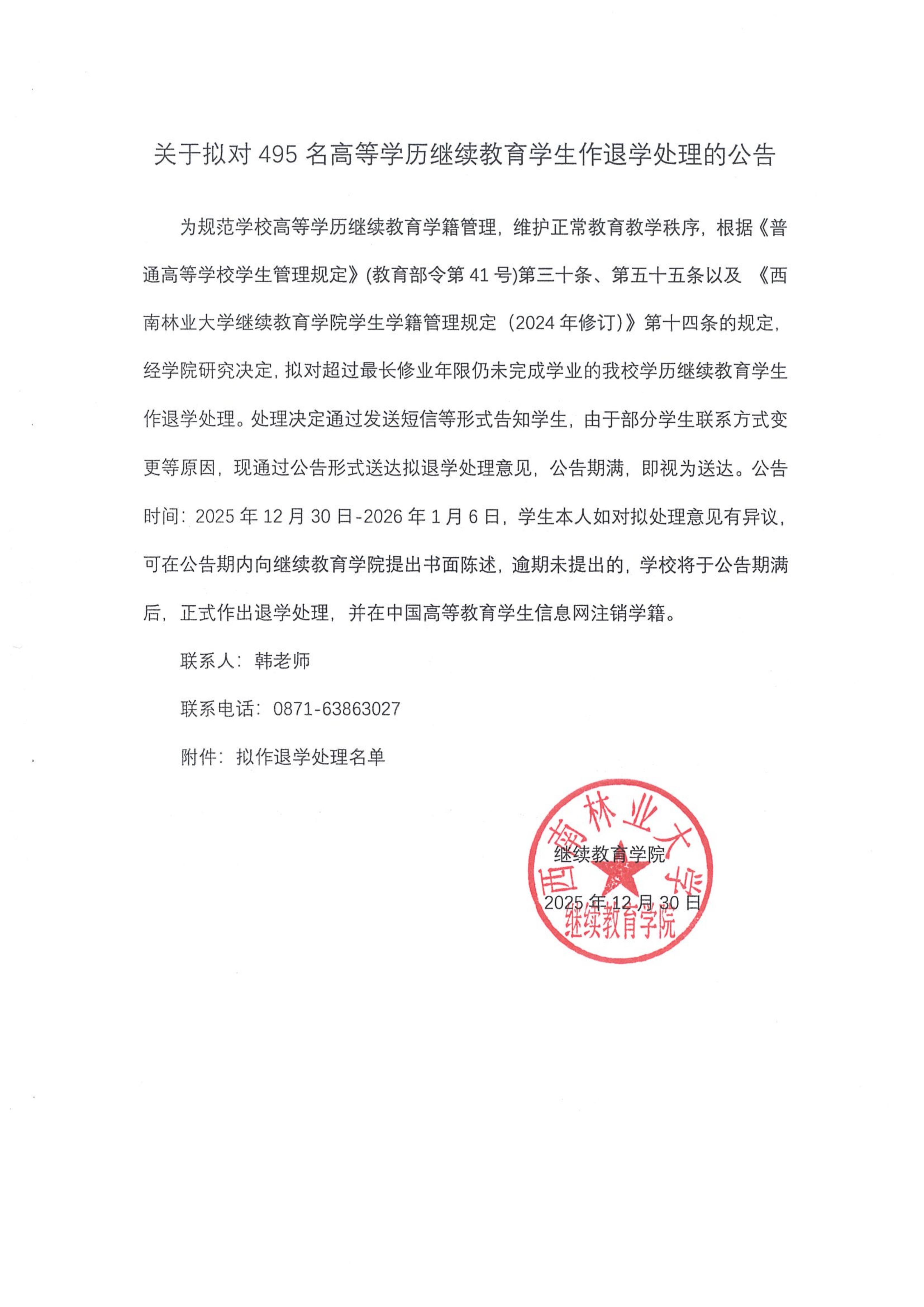 关于拟对495名高等学历继续教育员工作退学处理的公告